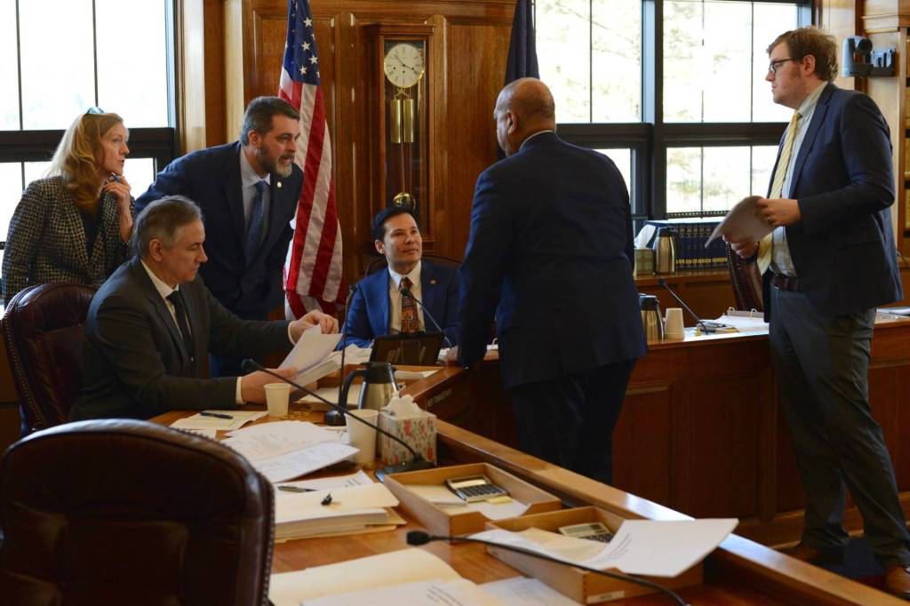 Members of the Alaska House Finance Committee, at left, listen to budget aide Remond Henderson during a break in amendment discussions on Monday, March 27, 2023. (James Brooks/Alaska Beacon)