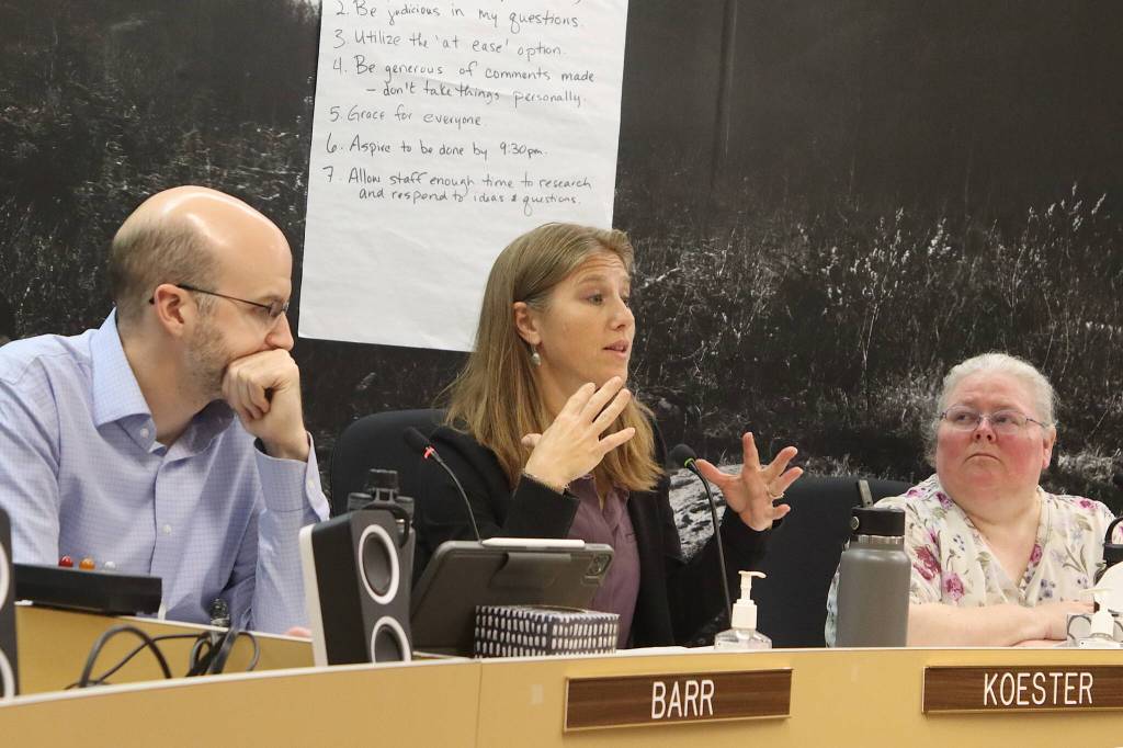 City Manager Katie Koester (center) explains options for a budget item to members of the Juneau Assembly’s Finance Committee during a meeting Wednesday night as Deputy City Manager Robert Barr and Finance Director Angie Flick listen. (Mark Sabbatini / Juneau Empire)