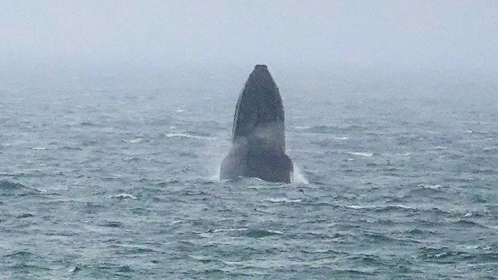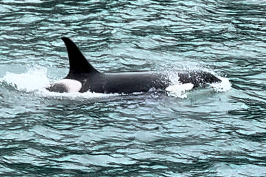 On the way back, things got even more very pleasing. There were humpback whales breaching repeatedly just ahead of us and more of them cruising quietly close to shore. Our boat was escorted by a pod of orcas, spread out on both sides of us. I have no idea how many there were, because each of them came up for air on its own schedule. We were all going in the same direction, so they were with us (or we were with them?) for some time. We assumed that these were the fish-eating type of orca, not the mammal-eaters, because they were spaced so far apart. A Dall’s porpoise came alongside the boat and, as they often do, swam in our wake, possibly sheltering from the orcas, just in case. Captain Dan did a fine job making sure that our boat behaved circumspectly and politely as we “swam” with the orcas.