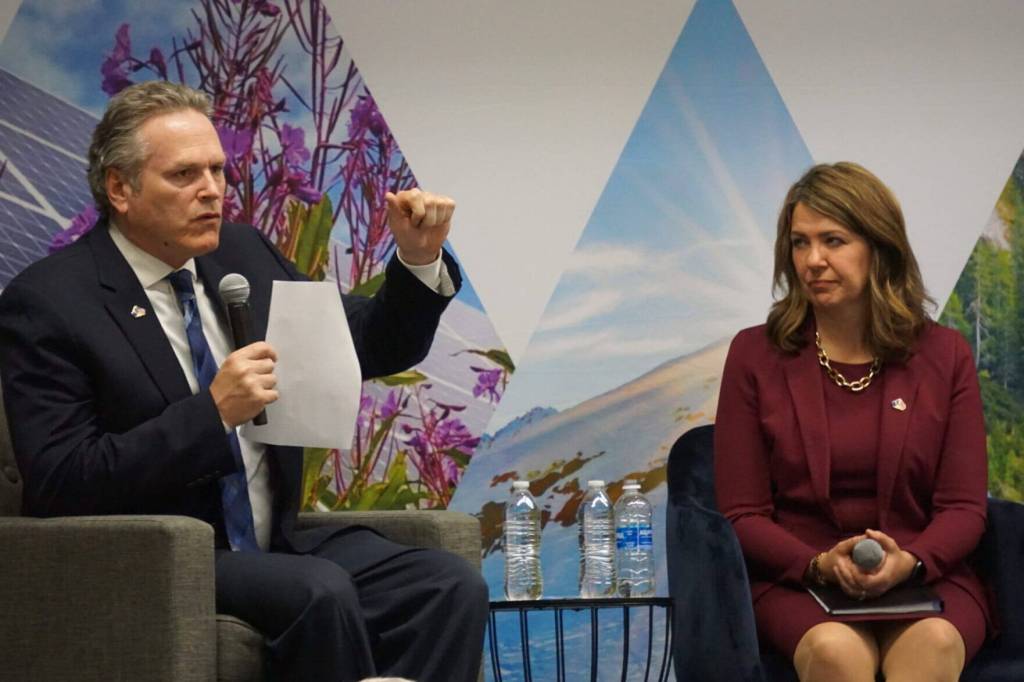 Gov. Mike Dunleavy speaks about his vision for Alaska’s energy future at the Connecting the Arctic conference held in Anchorage on Monday. Next to him is Alberta Premier Danielle Smith, invited to Anchorage to speak at this week’s Alaska Sustainable Energy Conference. (Yereth Rosen/Alaska Beacon)