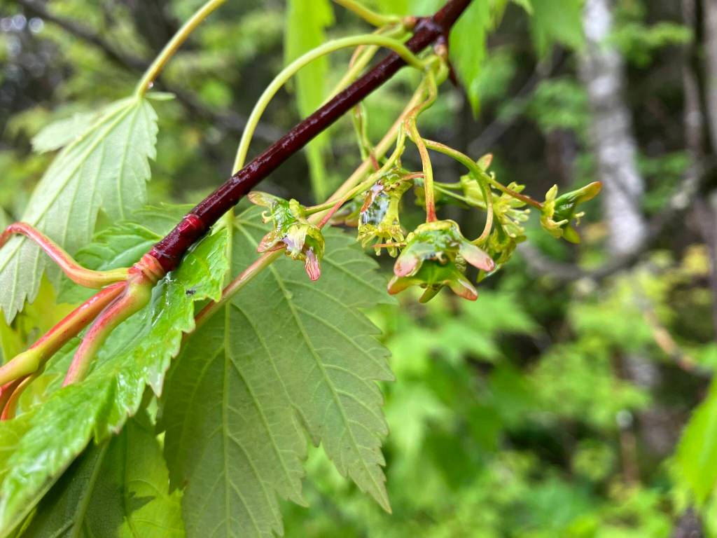 A stroll with a friend along the beaches of North Douglas, I noticed a little maple tree, whose leaves were three-lobed and sharply pointed. This is known here as Douglas maple, a species that ranges southward through the Rocky Mountains and the coast ranges, where it bears several other names. It is NOT vine maple, although sometimes called that; vine maple is a distinct species that does not occur as far north as Juneau. There are over 130 species of maple, mostly in Asia, and over a dozen species in North America, just one of which reaches Juneau.