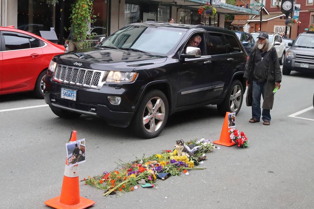 Flowers, notes, rucksacks, food, stuffed malamutes and dog biscuits were plentiful at two memorial sites on Front Street by early Tuesday evening. One was at the spot where Kissack was shot a short distance from a building entrance, the other in the covered doorway of another building that was one of his frequent sleeping spots.