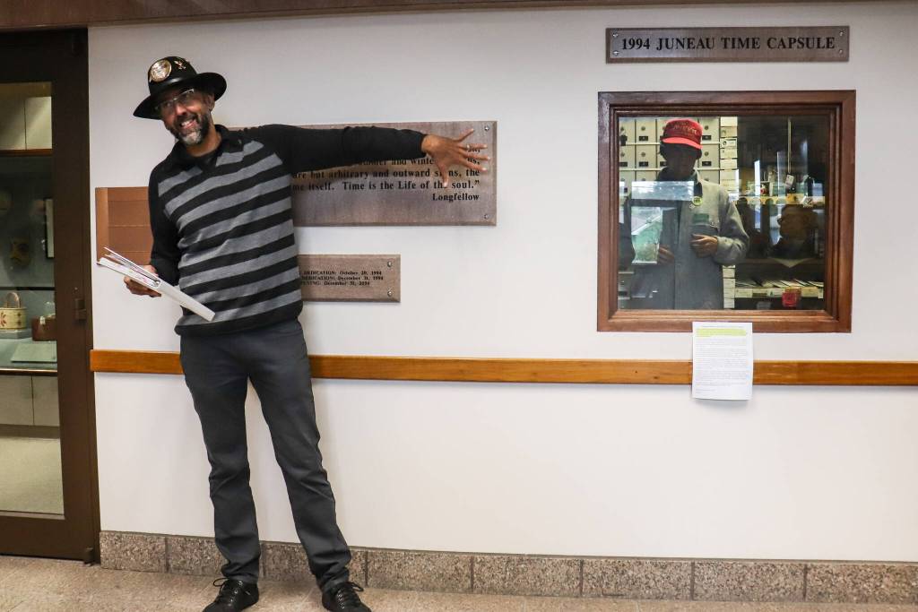 Jonathon Turlove, son of Michael Orelove, points at the 1994 Juneau Time Capsule inside the Federal Building on Friday for the 30th anniversary celebration. (Jasz Garrett / Juneau Empire)