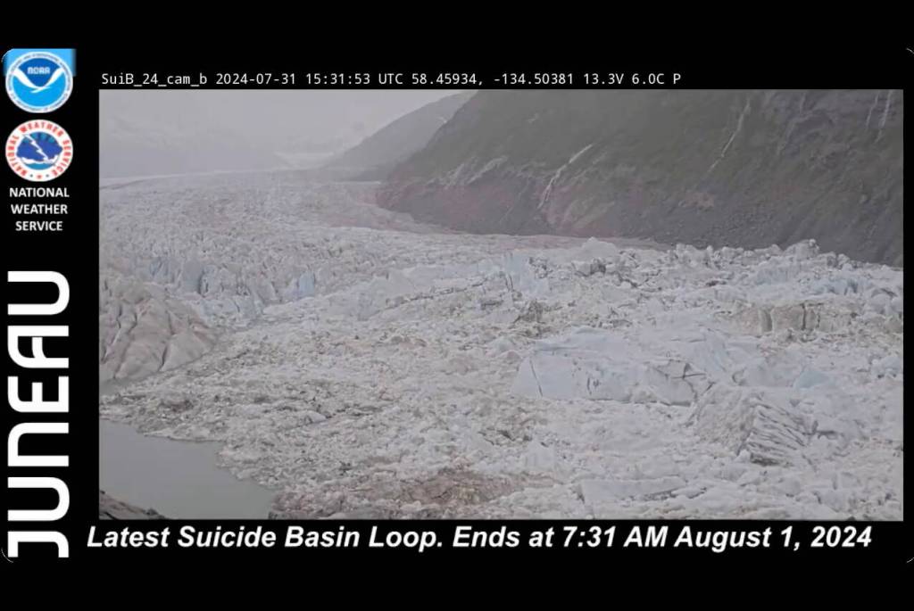 Suicide Basin has started flowing over the top of its ice dam and people downstream from the Mendenhall Glacier should be preparing for flooding impacts, but there was no indication as of mid-morning Friday a release of water from an outburst flood is occurring, according to National Weather Service Juneau officials.