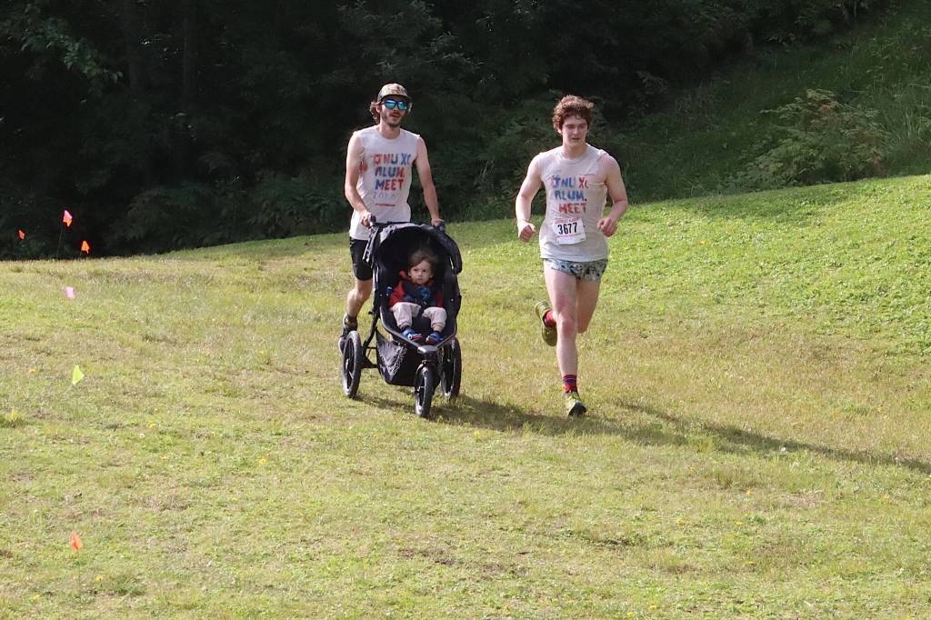 Dapcevich said he found out two weeks ago about the Sayéik Invitational, an unofficial meet pitting the cross-country team at the newly consolidated Juneau-Douglas High School: Yadaa.at Kalé against local high school alumni. He said he brought his son in the stroller after signing up for “the entertainment and the challenge.”