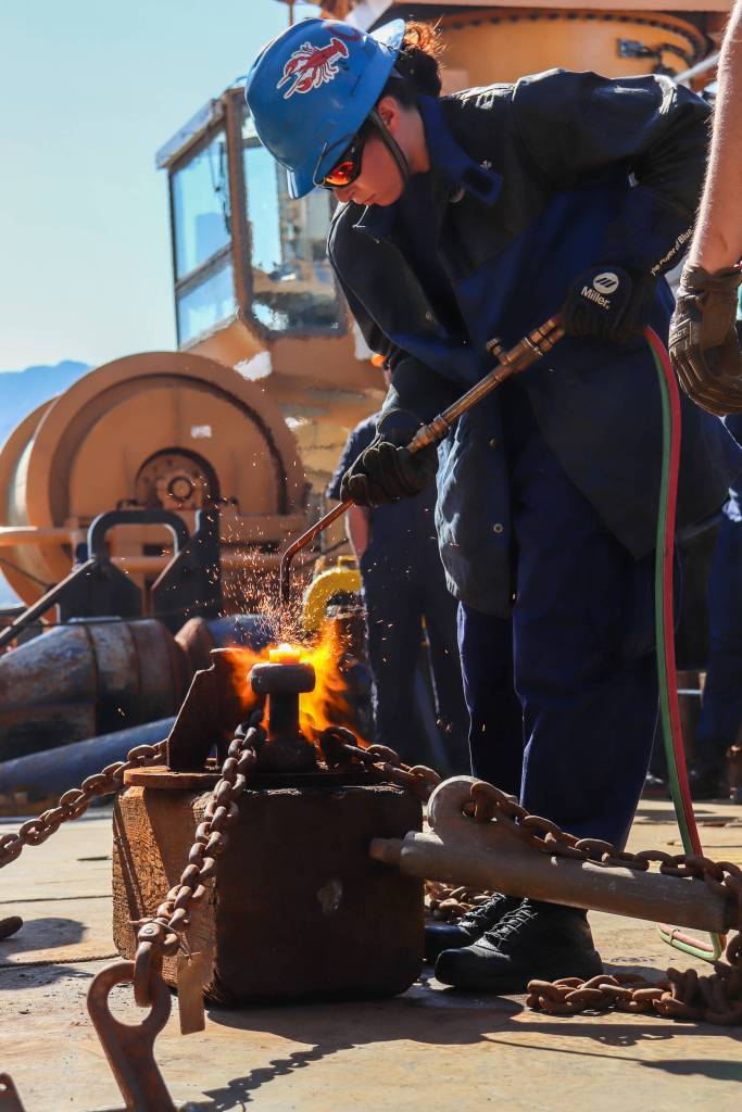 It was seaman Hailey Crawford’s second year participating in the Buoy Tender Olympics. She heated up the pin so the shackle could be hit down by her teammates. Crawford’s team, which placed first in the event, was visiting Juneau from Everett, Washington, aboard the Coast Guard keeper-class cutter Henry Blake.