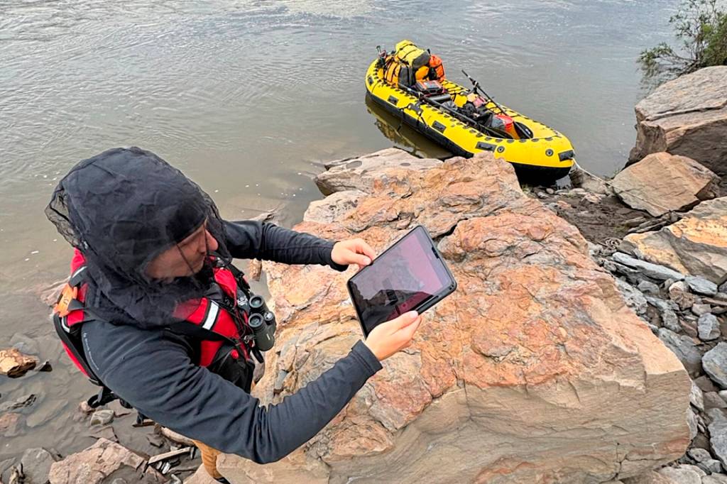 In early August 2024, Druckenmiller and his colleague Kevin May, along with Greg Erickson and Tyler Hunt of Florida State University, floated 160 miles along the upper Colville River on Alaska’s North Slope. There in the rocks on the shoreline, they found fossilized tracks of many species of dinosaur, as well as the pebbled skin impressions left behind by an armored ankylosaur and other plant-eating dinosaurs.