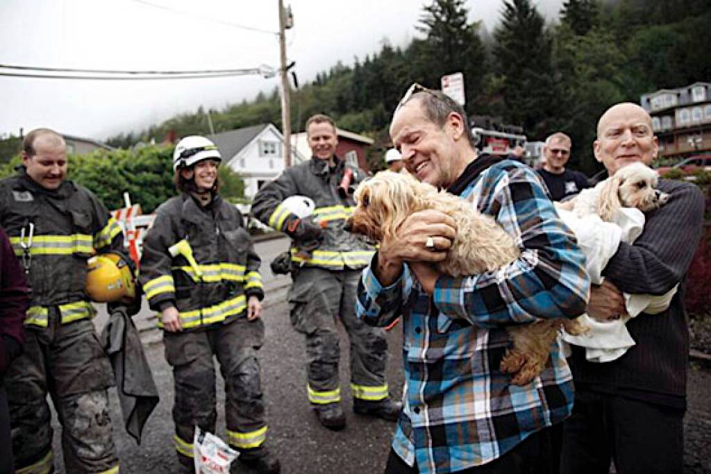 Ketchikan Fire Department firefighters with heroic efforts Sunday brought joy and some relief to the community as it grieves the loss of life and homes caused by the landslide above town on Aug. 25 with the dramatic rescue of two small dogs thought to have been lost a week earlier in the incident.