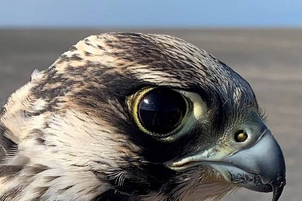 A male peregrine falcon that hatched in 2023 looks at the biologist who captured him on South Padre Island in Texas in late 2023. (Photo courtesy Padre Island Peregrine Falcon Survey)