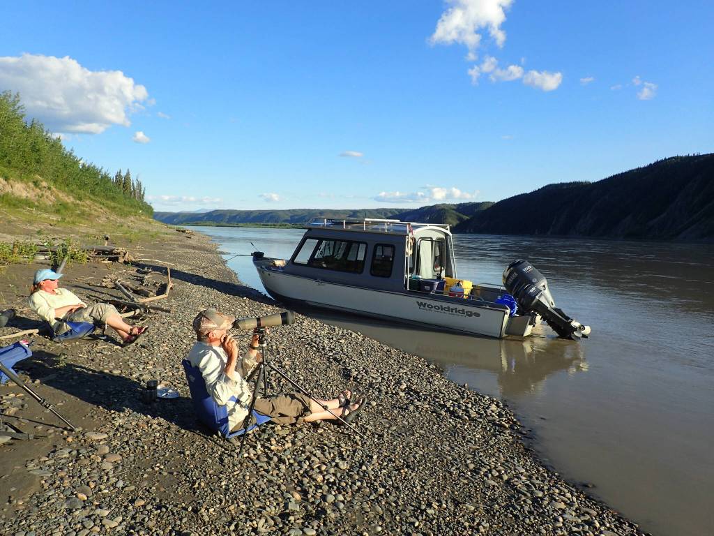 Chris Florian, left, and Skip Ambrose scan a cliffside across the upper Yukon River looking for peregrine falcons on July 13, 2018. (Photo by Ned Rozell)