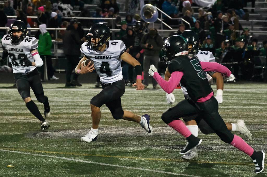 Johnson, a wide receiver who has been Juneau’s primary playmaker the past two seasons, started his second straight game at quarterback and largely ran at will against the Knights’ defense. On bursts through the middle of the line with power and around the edges with speed he scored on touchdown runs of 51, 13, 1, 22 and 20 yards before halftime. He finished the game with 287 yards rushing, according to the Alaska Sports Report.
