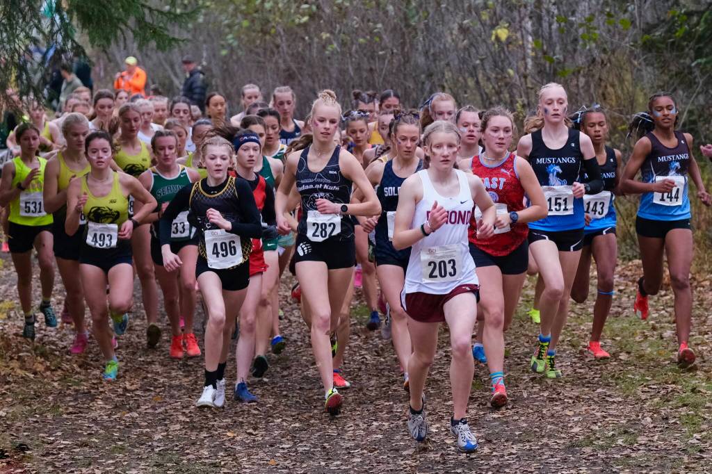 The Division I girls begin their first loop during the 2024 ASAA cross-country running state championships Saturday on the Bartlett High School Trails in Anchorage. (Klas Stolpe / Juneau Empire)