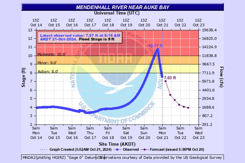 But Grant Smith, a NWS Juneau meteorologist, said in an interview at about 12:45 a.m. Monday the water level has been declining steadily since the reported crest and was at about 10.3 feet as of 12:30 a.m.