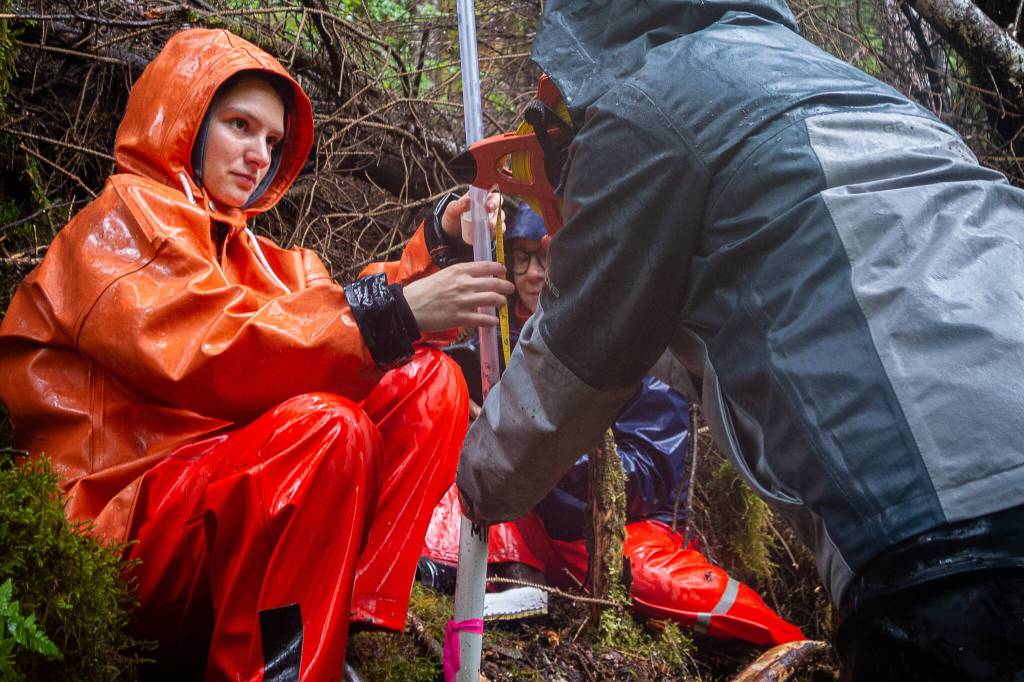 Prince of Wales Alaska Youth Stewards crew members perform landslide assessment fieldwork. (Photo by Zofia Danielson)