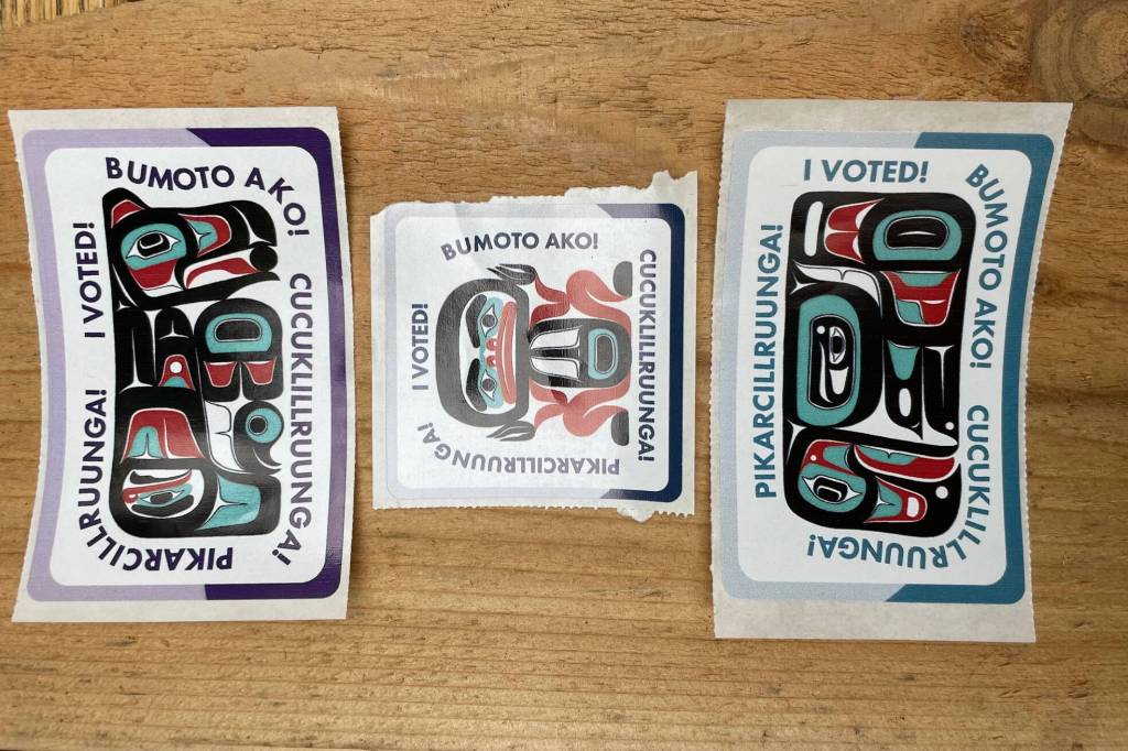 “I voted” stickers featuring Tlingit artwork by James Johnson are displayed on a table at an early voting station at the Mendenhall Mall annex Oct. 30. (Laurie Craig / Juneau Empire file photo)