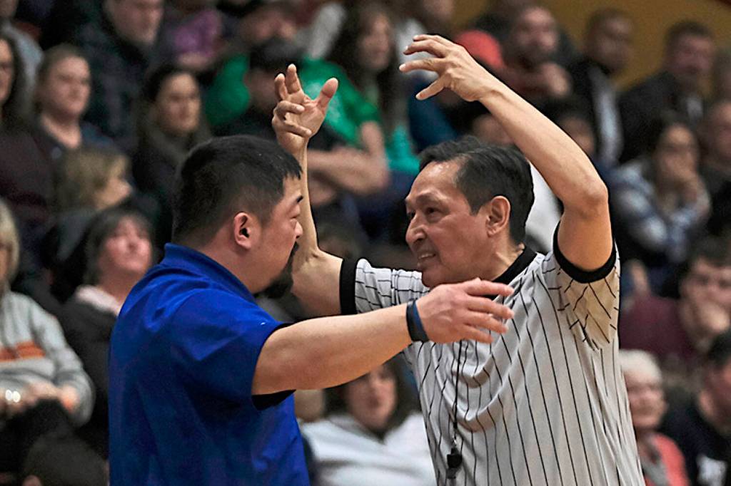 Sitka coach Jarret Harai and referee Ron Taug discuss a call during the 2019 Region V 3A Championship game in Mt. Edgecumbe’s B.J. McGillis Gymnasium. (Klas Stolpe / Juneau Empire)