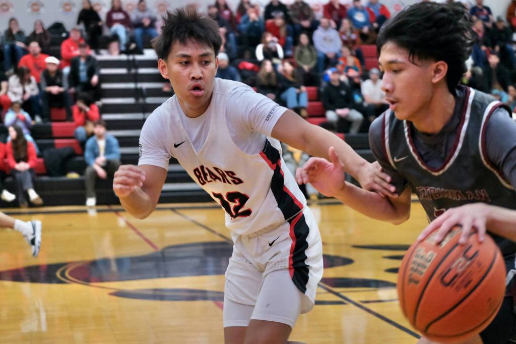 Juneau-Douglas High School: Yadaa.at Kalé junior Joren Gasga (12) guarding Ketchikan’s Edward Dela Cruz last weekend. Gasga was part of JDHS’ defensive pressure in Friday’s 71-46 win over Homer at the Palmer Elks Tournament in Palmer. (Klas Stolpe / Juneau Empire file photo)
