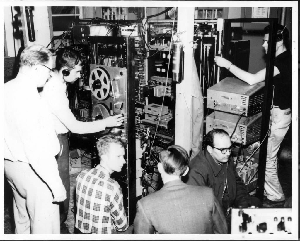In October 1957, researchers from the Geophysical Institute track the Sputnik 1 satellite In the Ballaine Lake Tracking Station on the UAF campus. From left are Bob Merritt, Joe Pope, Pete Michelow, Gordon Little, Glen Stanley and Ernest Stiltner. (Photo courtesy Geophysical Institute)