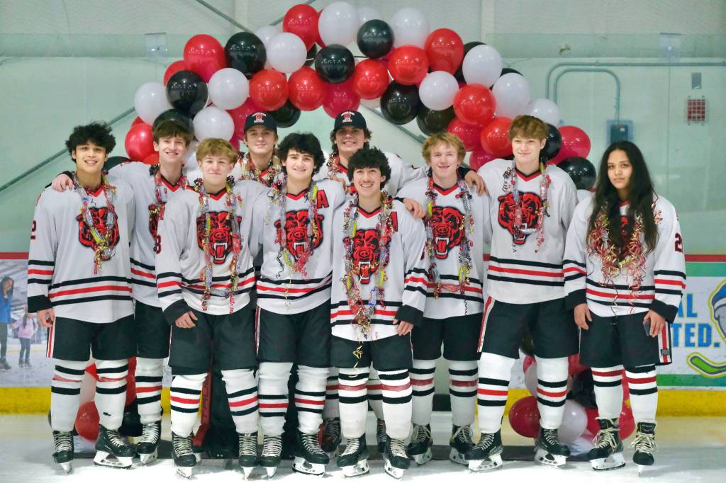 The Juneau-Douglas High School: Yadaa.at Kalé Crimson Bears seniors pose for a photo during Senior Night last weekend at Treadwell Ice Arena.They play final home games this weekend. On Friday facing Tri-Valley at 1:45 p.m. and Wasilla at 7 p.m. and on Saturday playing Wasilla at 3 p.m. and Tri-Valley at 8 p.m. JV play Thursday at 3:30 p.m. (Klas Stolpe / Juneau Empire)