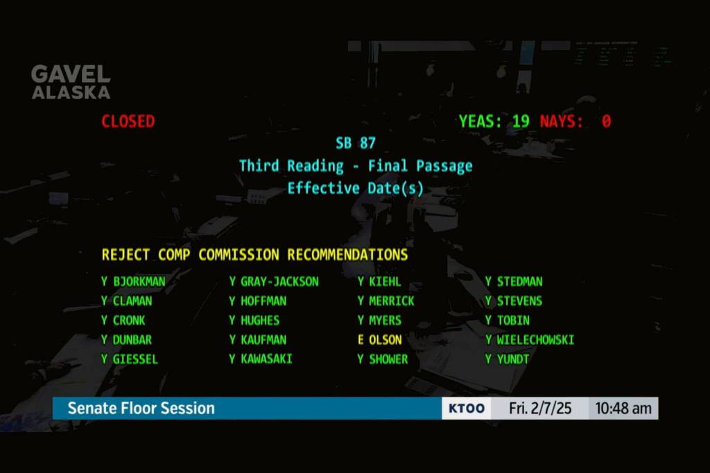 The Alaska Senate essentially rejected giving themselves and other state leaders automatic pay raises linked to inflation with the unanimous passage of a bill Friday that rejects a commission’s recommendation to implement such raises.
