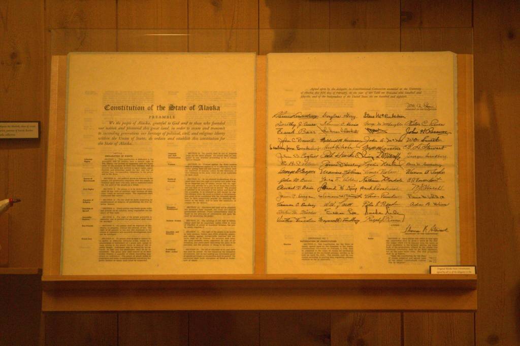 The Constitution of Alaska on display in the Seattle University School of Law library in January 2023. (Creative Commons photo)