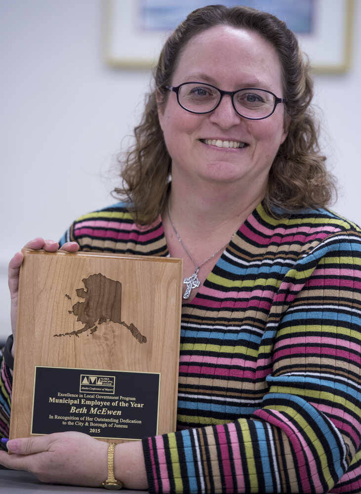 Beth McEwen with the Municipal Employee of the Year Award she won in 2015 as the deputy municipal clerk for the City and Borough of Juneau. (Juneau Empire file photo)