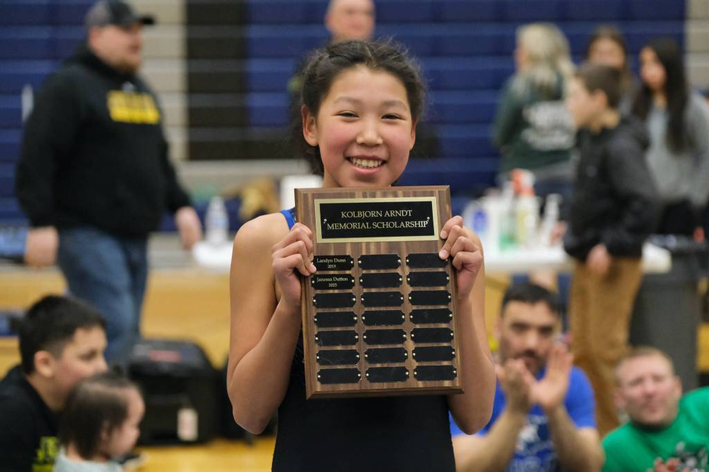 Youth wrestler Janessa Dutton was awarded the Kolbjorn Arndt Memorial Scholarship during Saturday’s elementary school age wrestling tournament at Thunder Mountain Middle School. (Klas Stolpe / Juneau Empire)