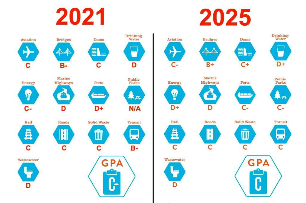 Alaska improved from a C- four years ago to a C on an Infrastructure Report Card presented Wednesday by the American Society of Civil Engineers, with funding from the Infrastructure Investment and Jobs Act cited as a key factor.