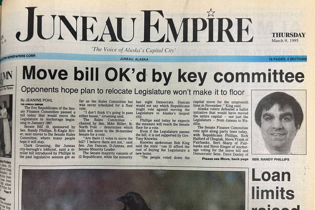 This week in 1995, the five Republicans of the Senate Finance Committee passed a bill today that would move the Legislature to Anchorage beginning in January 1997. Senate Bill 19, sponsored by Sen. Randy Phillips, R-Eagle River, next moves to the Senate Rules Committee, where many people hope it will stay. Clark Gruening, the Juneau city-borough’s lobbyist, said a similar bill introduced by the legislature in the past session got as far as the Rules Committee, but was never scheduled for a floor vote. “I don’t think it’s going to pass either house,” Gruening said. The Rules Committee, chaired by Sen. Mike Miller, R-North Pole, determined which bills will move to the 20-member Senate for a vote. “Are there 11 votes to move the bill? I believe there are not,” said Sen. Jim Duncan, D-Juneau, and Senate Minority leader. The Senate majority consists of 12 Republicans, while the minority has eight Democrats. Duncan would not say which Republicans might vote against moving the Legislature to Alaska’s largest city. Even if the Legislature passes the bill it is not supported by Democratic Gov. Tony Knowles.