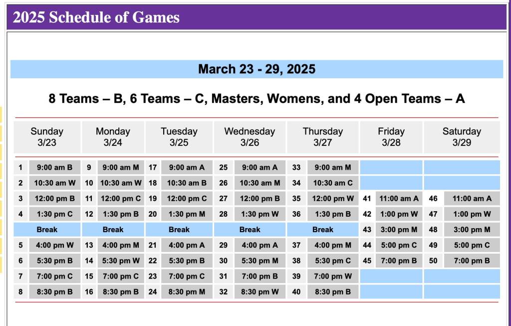 Of special note will be Sunday’s opening games. For the first time the opening day will be filled with more games than the usual Sunday brunch bracket with action from 9 a.m. to the final game starting at 8:30 p.m.. The B, C and Women’s brackets will all be in action.