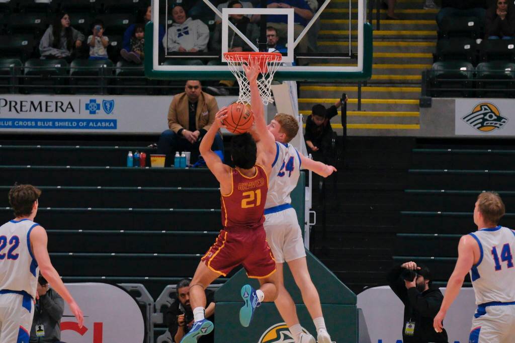 Conference rivals and neighbors separated by a span of bridge 1,255 feet long, the Sitka Wolves and Mt. Edgecumbe Braves boys basketball teams went head-to-head in a Thursday night semifinal at the 2025 ASAA March Madness Alaska 3A/4A Basketball State Championships in Anchorage’s Alaska Airlines Center and the two teams did not disappoint.