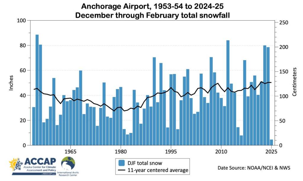 “For the three locations with 50-plus years of snowfall data, both Anchorage airport and Alyeska had the lowest mid-winter totals, while the Matanuska Experiment Farm was third lowest, with 1981-1982 and 2015-2016 having lower reported totals,” wrote the climatologist for the Alaska Center for Climate Assessment and Policy at the University of Alaska Fairbanks.