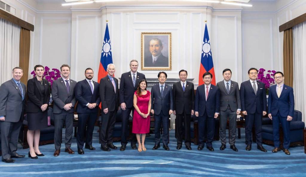 Gov. Mike Dunleavy and other state of Alaska officials pose for a photo with Taiwan President Lai Ching-te, center, and other government officials during Dunleavy’s trip to Taiwan last month. (Taiwan Office of the President photo)