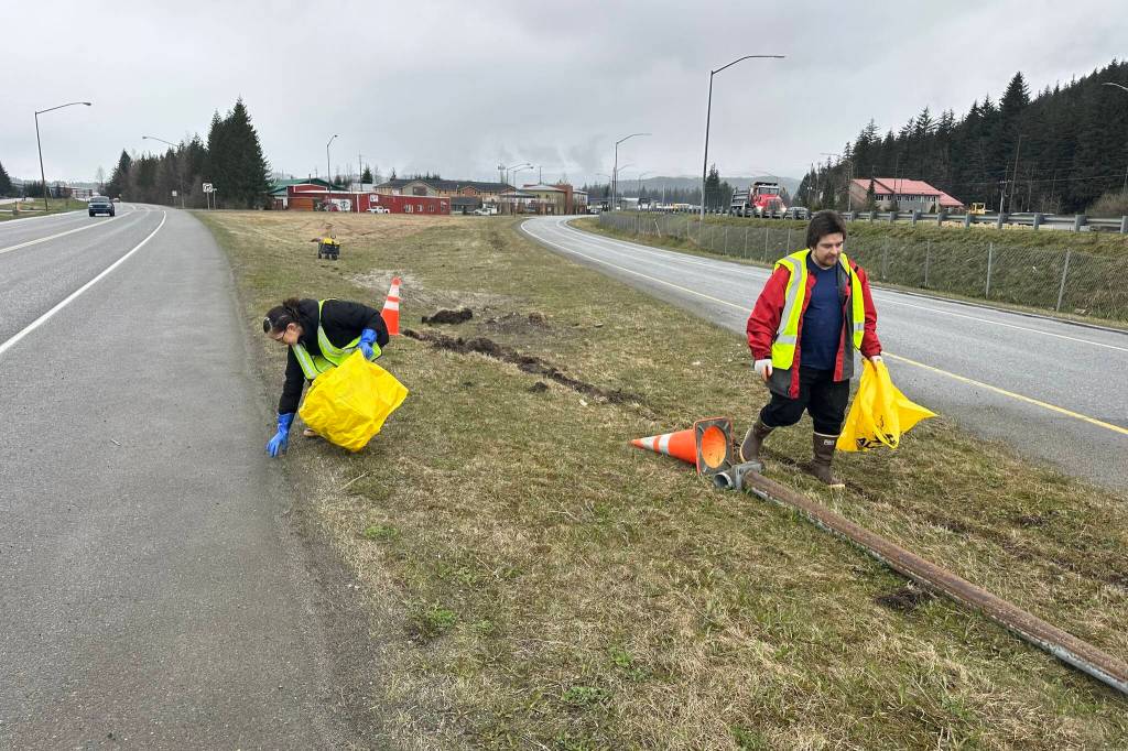 Regina Demmert and Casey Yakovich clean up trash in a median strip near Juneau International Airport on Saturday. (Mark Sabbatini / Juneau Empire)