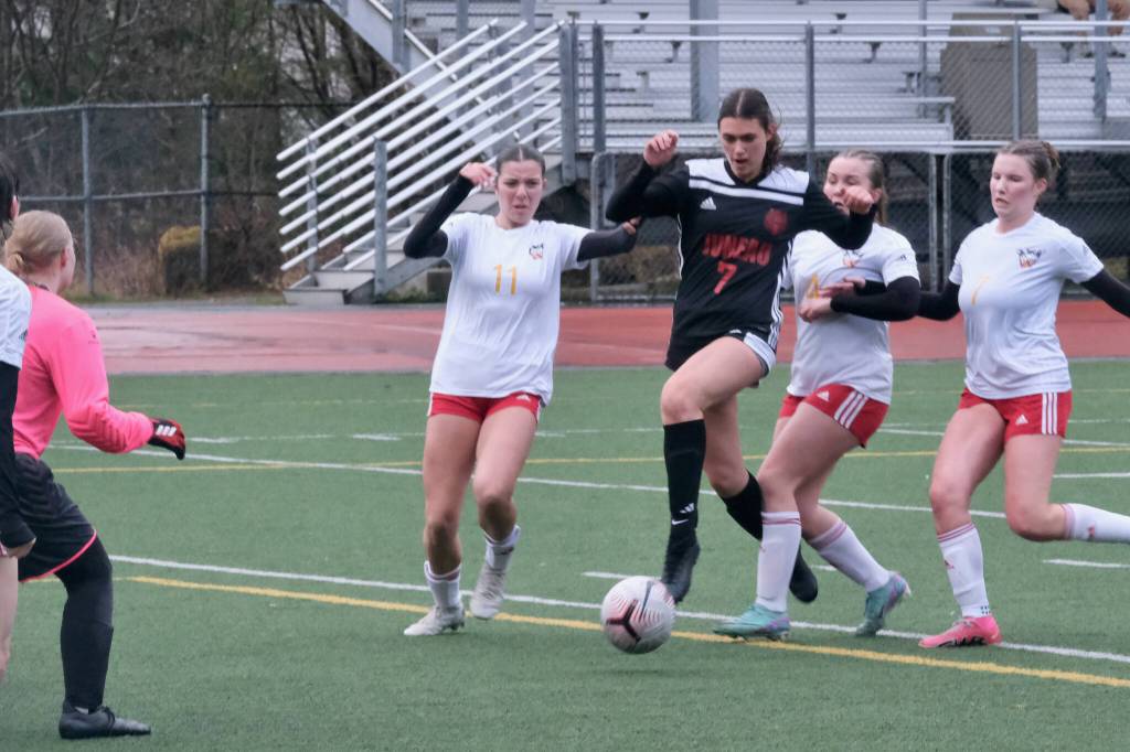Juneau-Douglas High School: Yadaa.at Kalé junior Kenzie Simonson (7) scores under pressure from West Valley juniors Evyn Bowen (11), Anna Baysinger (4) and Lola Seitz (7) during the Crimson Bears’ 5-2 loss to the Wolfpack on Friday at Adair Kennedy Park. The teams play again at 10 a.m. Saturday. (Klas Stolpe / Juneau Empire).