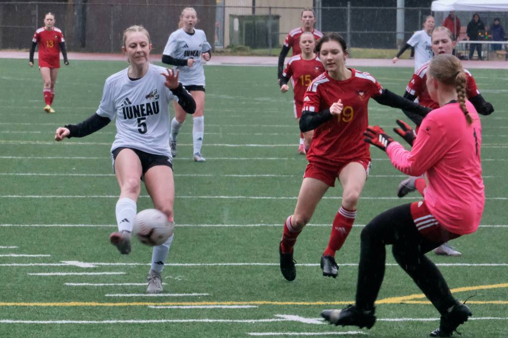 The Juneau-Douglas High School: Yadaa.at Kalé Crimson Bears girls soccer team flipped the pitch against Railbelt Conference foe West Valley at Adair Kennedy Park, topping the visiting Wolfpack from Fairbanks 2-1. JDHS had lost 5-2 on Friday.