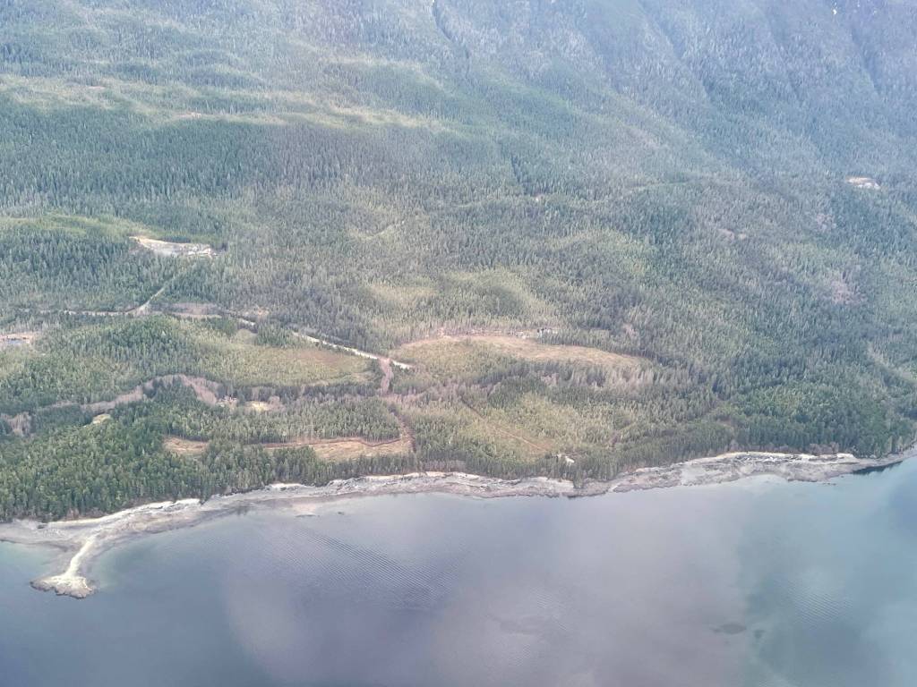An aerial view of west Douglas taken on Sunday, April 20, 2025, shows the property Goldbelt Inc. plans to develop and has begun clearing. (Laurie Craig / For the Juneau Empire)