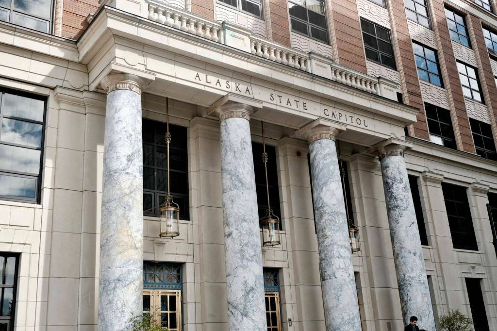 The Alaska State Capitol is seen in partial morning sun on May 10, 2024. (Claire Stremple/Alaska Beacon)