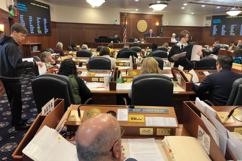 House pages distribute amendments to a bill reviving a traditional pension system for public employees during a floor session at the Alaska State Capitol on Saturday. (Mark Sabbatini / Juneau Empire)
