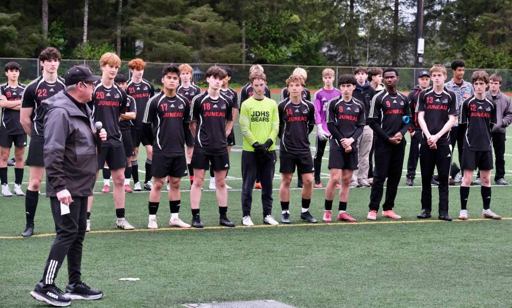 Juneau-Douglas High School: Yadaa.at Kalé boys head soccer coach Gary Lehnhart speaks about his senior players as they look on during Saturday’s Crimson Bears senior appreciation game at Adair-Kennedy Memorial Park. (Klas Stolpe / Juneau Empire)