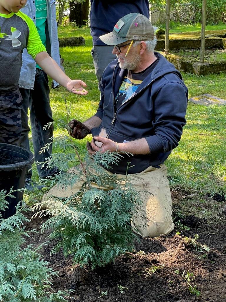 Ben Patterson, Parks and Recreation Department landscape supervisor and arborist for the City and Borough of Juneau, helps students plant young cedar trees at Evergreen Cemetery on Monday, May 19, 2025. A student shows two spruce tips in his open palm to Patterson. (Laurie Craig / For the Juneau Empire)