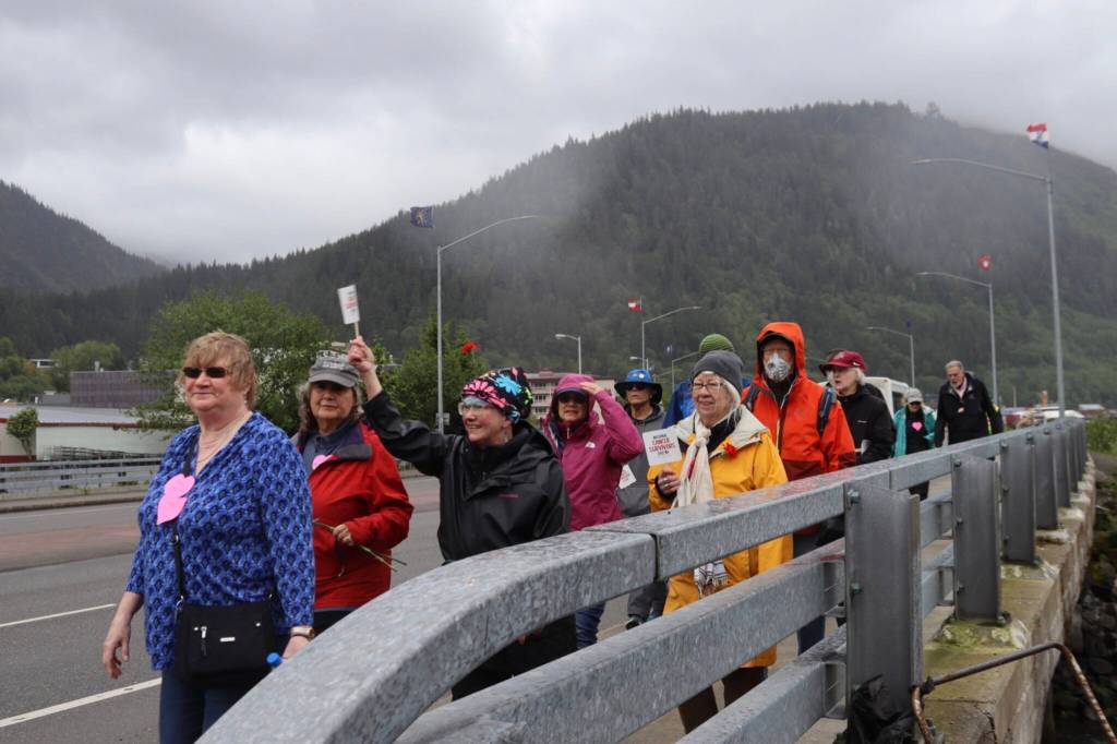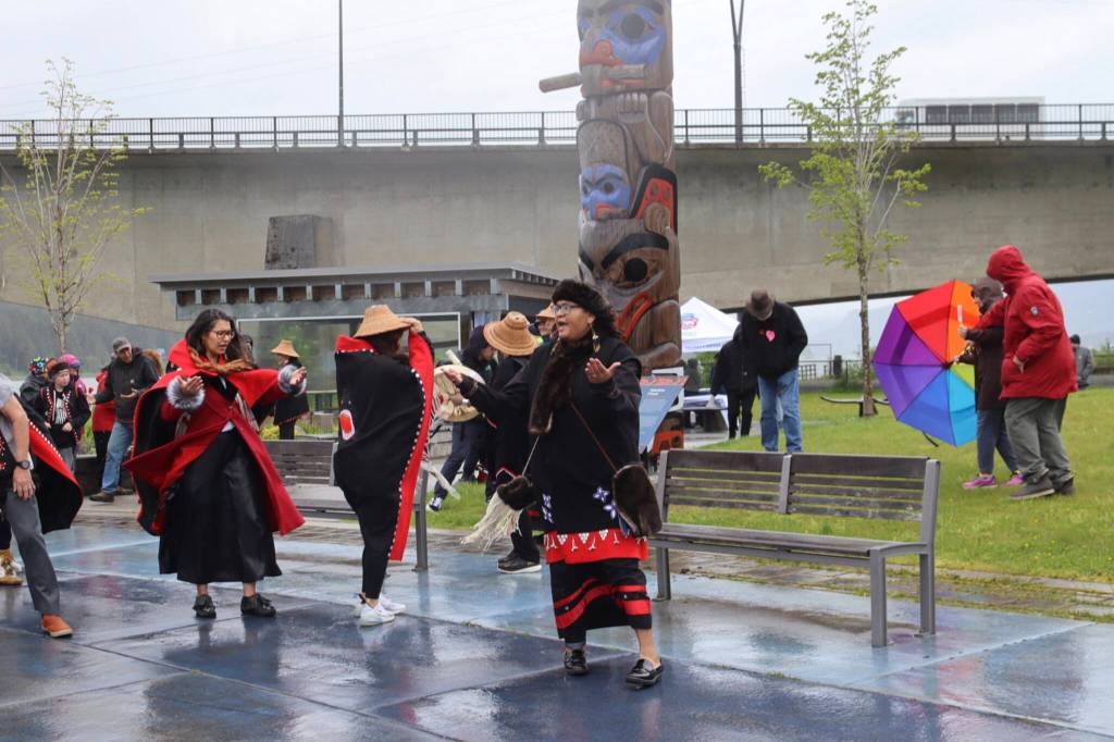 The City of Juneau Pipe Band met the group at the downtown Seawalk for the final stretch of the walk. Survivors rang a bell as they reached Overstreet Park similar to the ones used when a patient is discharged from chemotherapy. At the Tahku whale sculpture, the sounds of bagpipes and drums were replaced by songs from the Yées Ḵu.oo Dance Group.