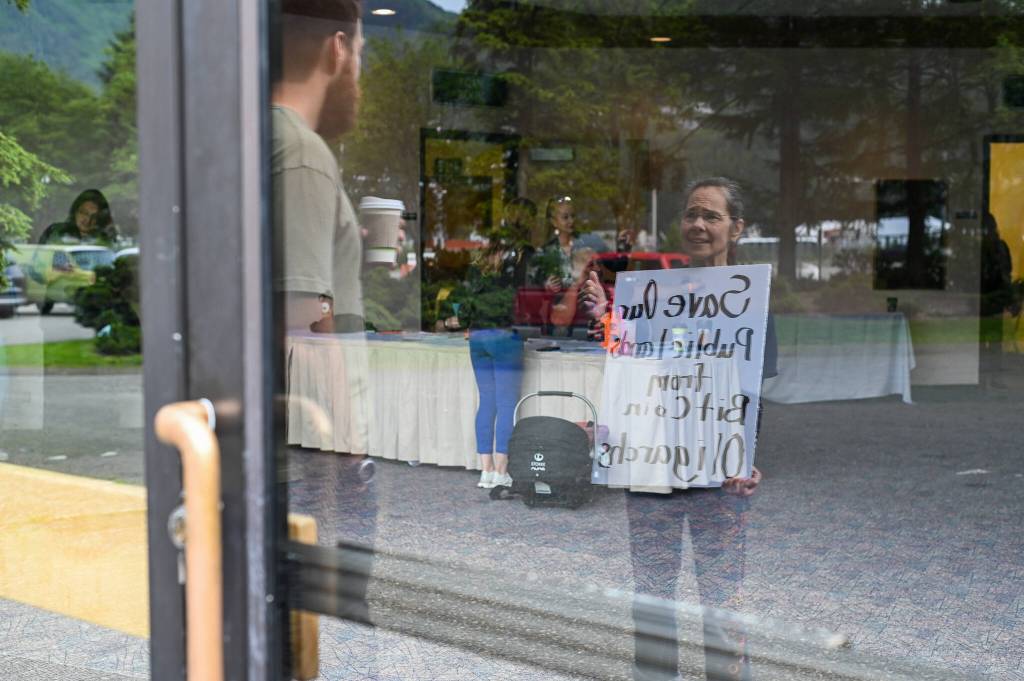 She and other members of Juneau Indivisible, a nonprofit political organization, said the protest was not about the conference itself or Bitcoin — “it was just an opportunity to see Nick Begich, because he won’t see us.”