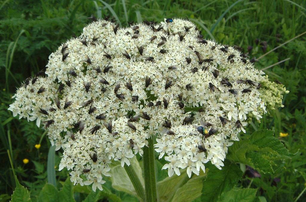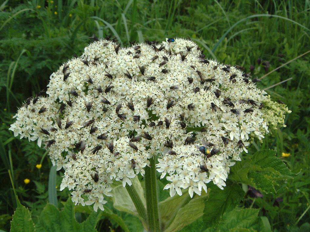 The last half of June and very early July were notable for (among other things) big displays of white flowers. In the open meadows the huge, flat inflorescences of cow parsnip dominated large areas. The flowers are pollinated by small insects that sometimes gather in crowds on the inflorescences.