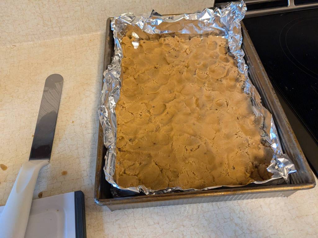Press mixture into lined baking pan.