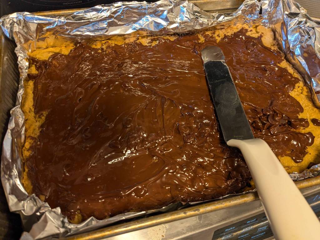 Return pan to the oven for about one minute. Remove and with an offset spatula evenly spread the now melted chocolate over the crust.