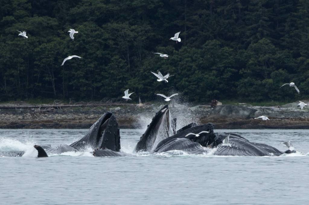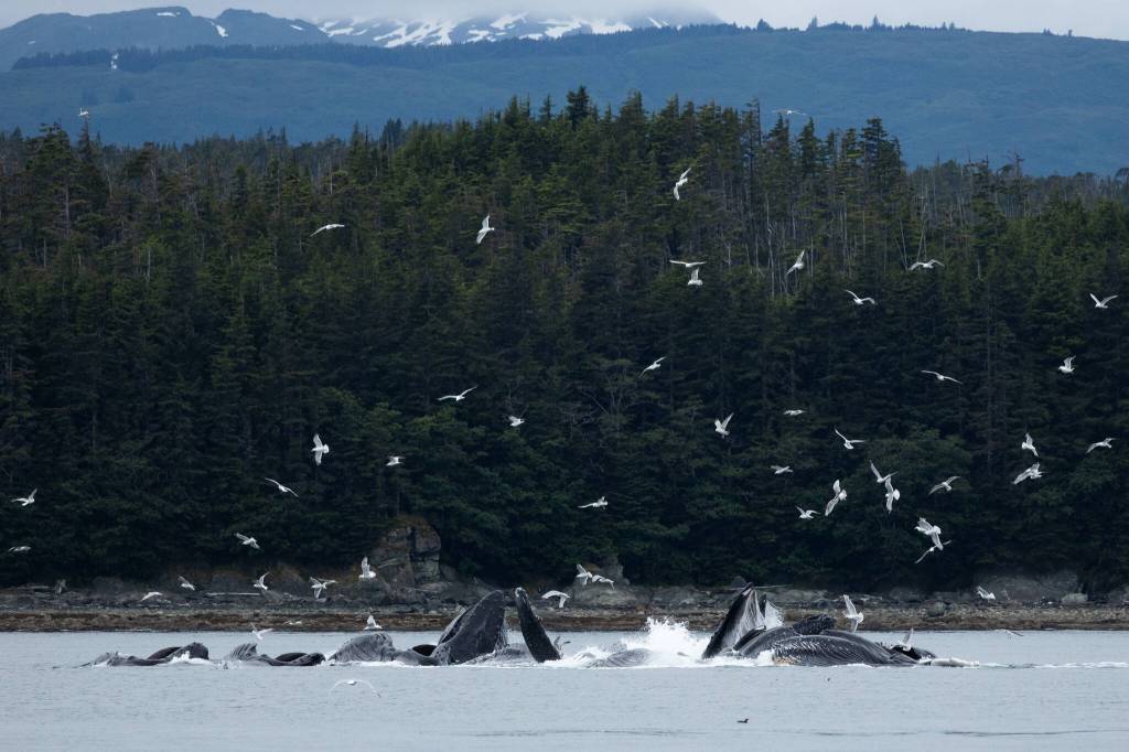 The gulls begin dive-bombing the water as the vocalization crescendos. I press my eye against my camera’s viewfinder and capture dozens of photos in the few seconds it takes the whales to lunge out of the water and gulp down hundreds of fish. The cruise ship passengers I’m guiding are exclaiming, clapping and taking countless photos and videos as 14 massive whales swim away. As our captain starts the boat’s engines and begins heading back to the harbor, I reiterate to my guests that what we just witnessed is among the rarest forms of humpback whale behavior.