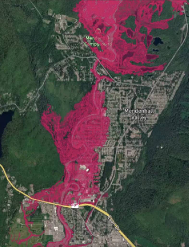 A flood inundation map shows areas in Juneau's Mendenhall Valley that are urged to evacuate during the 2025 annual glacial outburst flooding event, which is estimated to have begun Monday evening and expected to crest Wednesday afternoon.