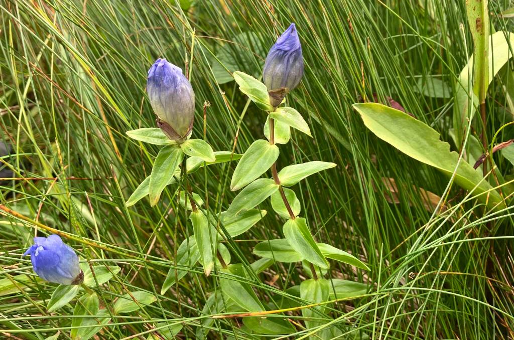 Meanwhile, up in the Crow Hill muskeg-meadows, lady’s tresses were still blooming nicely (indeterminately). This little orchid is pollinated mostly by bees, and the dust-like seeds are wind-dispersed. There were lots of swamp gentians (or Douglas gentians), whose small white flowers were almost lost in the exuberant sedges. A determinately flowering annual, it is probably pollinated by flies and bees. Blue-flowered broad-petaled gentians poked their solitary flowers up over some of the sedges. The colorful flower does not open; a visiting bumblebee is strong enough to pry the petals apart, find a bit of nectar, and potentially pollinate the flower. The seeds are small and may be dispersed chiefly by wind.