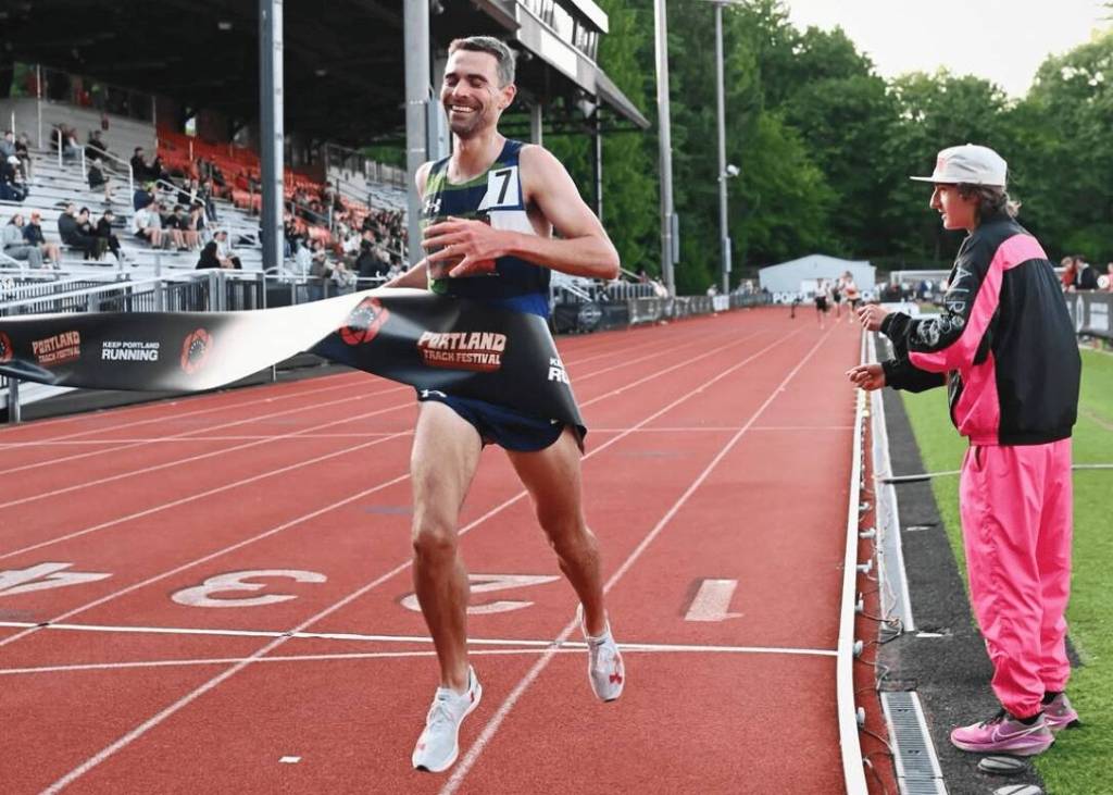 Isaac Updike breaks the tape at the Portland Track Festival. (Photo by Amanda Gehrich/pdxtrack)